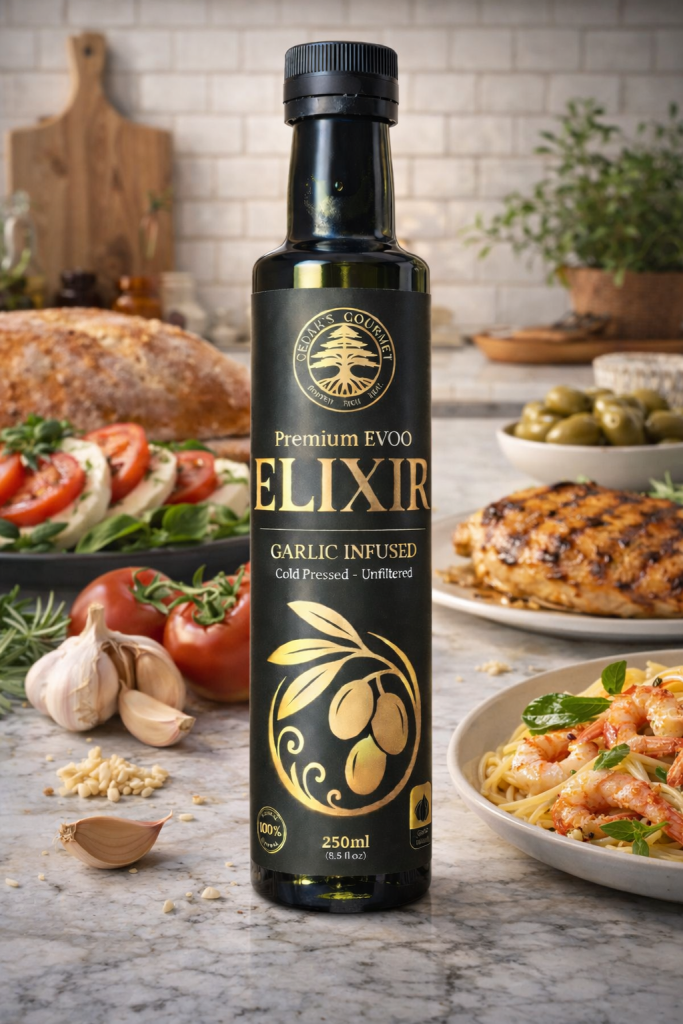 Rich, savory, and unmistakably aromatic, our Garlic Infused EVOO Elixir is crafted using cold-pressed Lebanese extra virgin olive oil infused with natural garlic. Smooth and well-rounded, it delivers the depth of roasted garlic without bitterness, allowing the purity of the olive oil to shine.